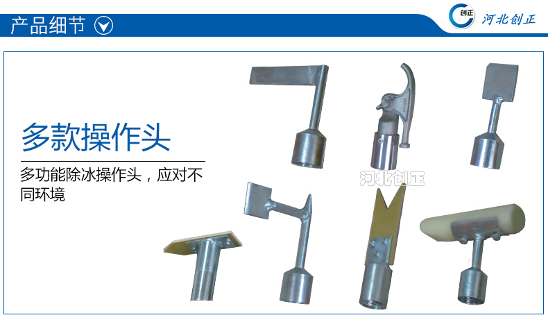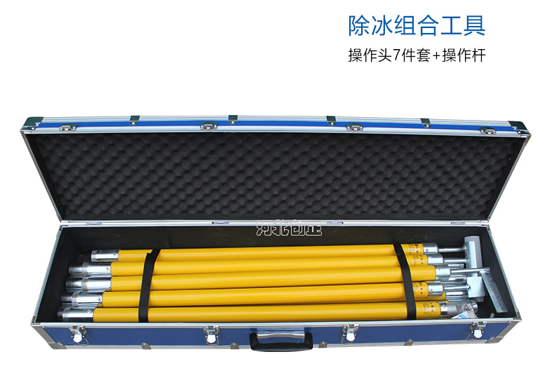 除冰组合工具由绝缘杆和不同的操作头组成,通过敲、铲、钩等方式除去瓷瓶、支架、导线及杆塔上的积雪及覆冰。除冰作业时,选取操作头,安装到绝缘杆的一端并拧紧后使用。绝缘杆分为长、短规格,根据现场实际情况进行组合。