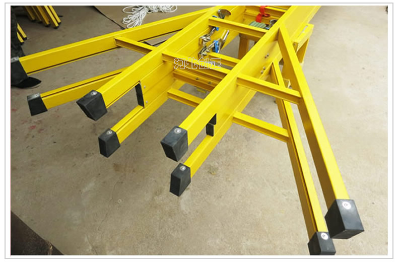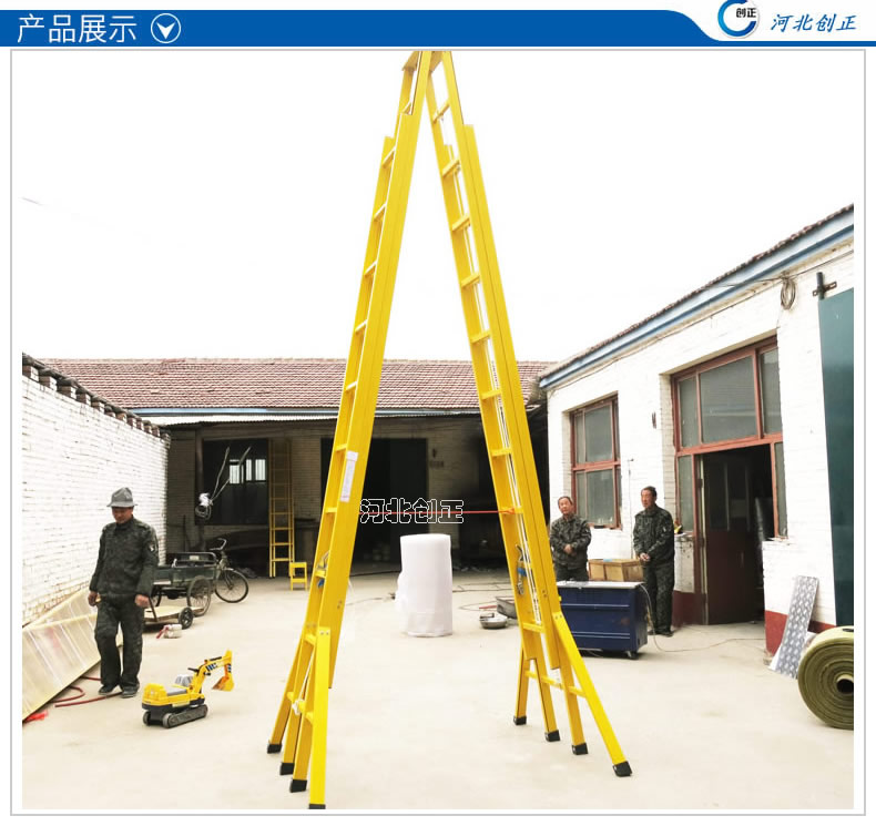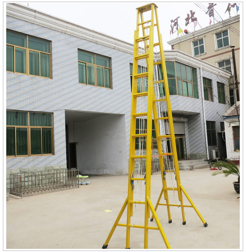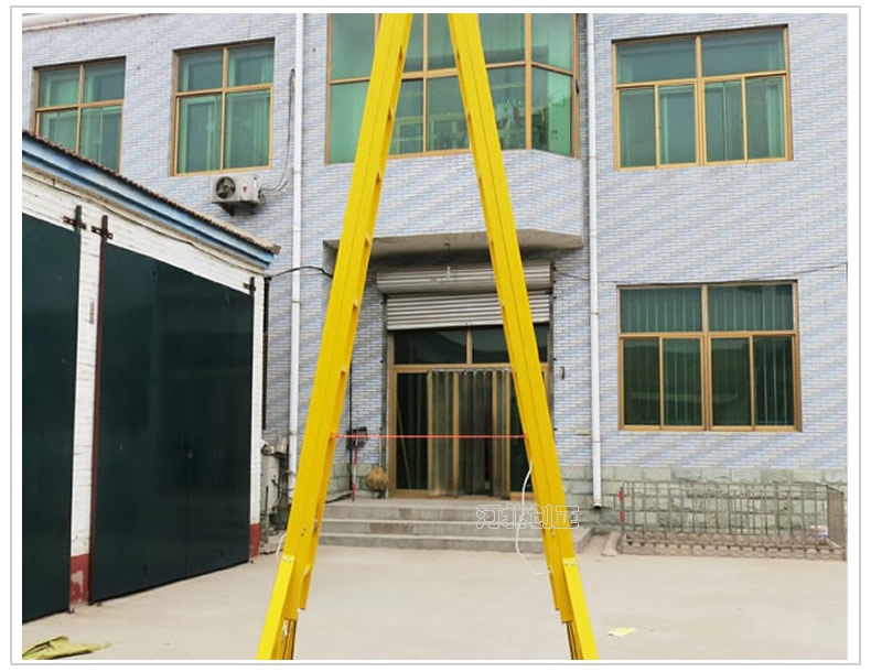 (2)使用时:选择坚硬、平整的地面,不要侧歪;使用5米以上的,要在产品中上部设立F8以上拉线;检查梯脚是否与地面接触良好;不能附加其它结构,不使用损坏的产品;严禁手握横撑,要在工作负荷范围内使用;