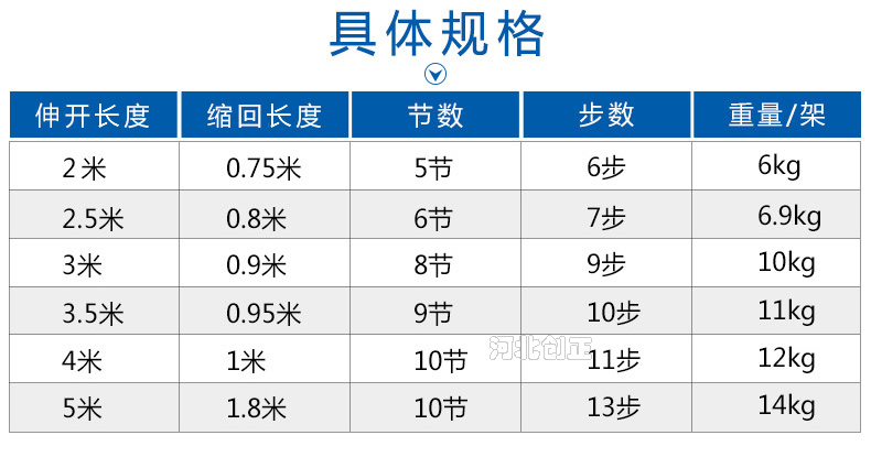 伸态5.0m, 缩态1.20m, 10节, 13步;