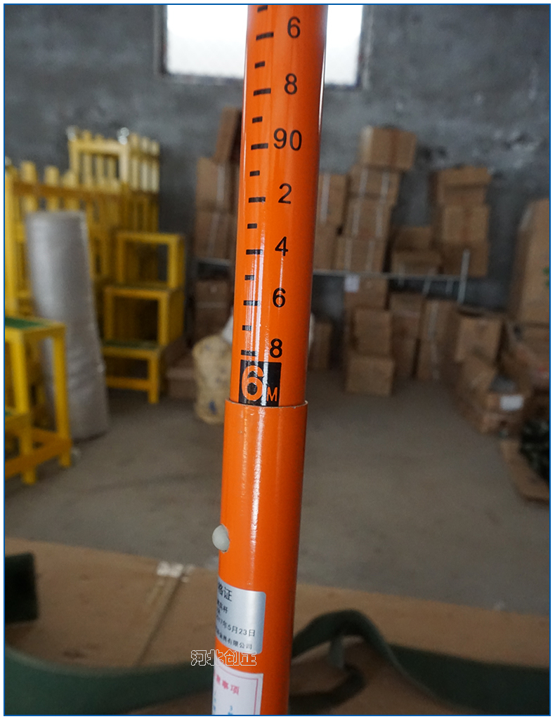 4、测量时,由内层绝缘杆向上抽起,每根绝缘杆的刻度对应外面一层绝缘杆的尺寸刻度,然后旋紧绝缘杆,测高杆的金属挂钩挂在高压线路上,此时外侧的绝缘杆上沿对齐抽起的绝缘杆的刻度;