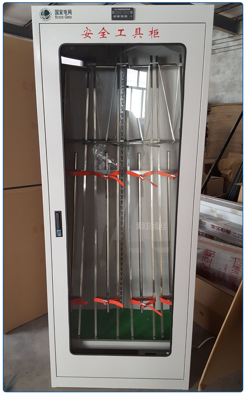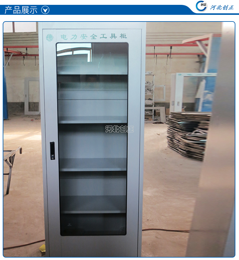 1、柜体是冷轧钢板卷压成型,厚度有1.0mm,1.2mm,1.5mm供选择。柜体表面采用静电防腐喷塑工艺,颜色为驼灰色,柜门装有通体透明钢化玻璃,透过玻璃可以看到分类有序的工器具。