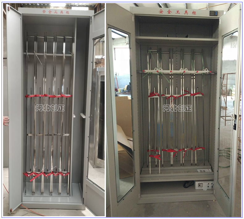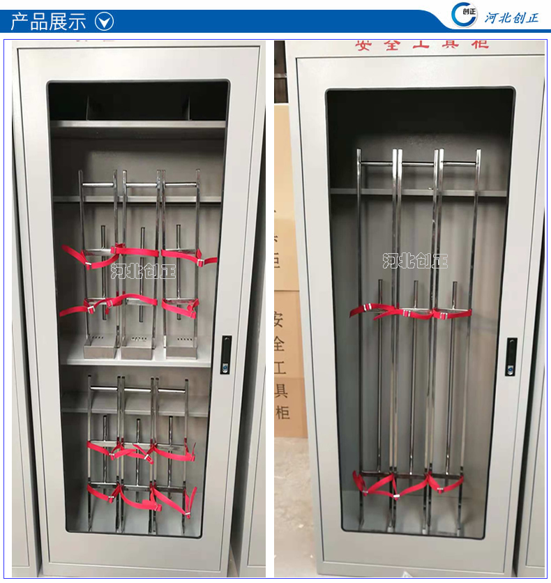 1、柜体是冷轧钢板卷压成型,厚度有1.0mm,1.2mm,1.5mm供选择。柜体表面采用静电防腐喷塑工艺,颜色为驼灰色,柜门装有通体透明钢化玻璃,透过玻璃可以看到分类有序的工器具。