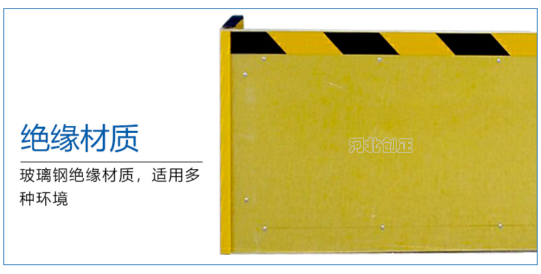 玻璃钢绝缘挡鼠板采用玻璃钢板材制做。挡鼠板上部贴黄黑相间反光条,反光条为反光膜加背胶纸制作。