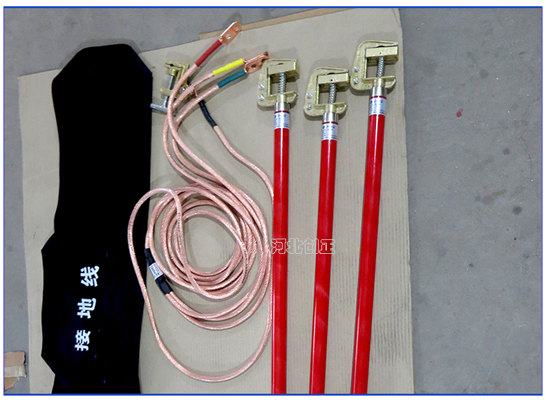 (2)、安装:将接地软铜线和接线端子固定在接地棒上的接电夹的相应位置上,将接地线尾线的接线端子固定在接地夹或地针上,构成一套完整的接地线。