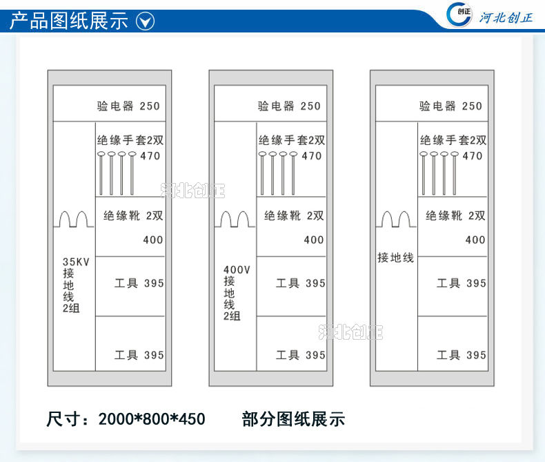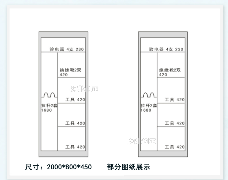 1、柜体是冷轧钢板卷压成型,厚度有1.0mm,1.2mm,1.5mm供选择。柜体表面采用静电防腐喷塑工艺,颜色为驼灰色,柜门装有通体透明钢化玻璃,透过玻璃可以看到分类有序的工器具。